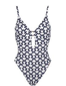 Badeanzug mit hohem Beinausschnitt, Soft Cups und verstellbaren, abnehmbaren Trägern. Cut-outs und Ringelement am Dekolleté. Dezentes, goldfarbenes Logo am Beinausschnitt.