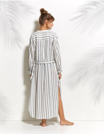 Maxi-Bluse zum Knöpfen, mit langen Ärmeln und einem Taillengürtel zum Binden.