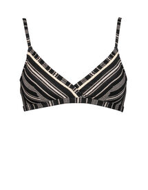 Weiße Effektstreifen und eingesetzte Stickbänder verleihen der schwarzen Basis Licht und Dreidimensionalität. Die Cover-Ups erscheinen mit geradlinigen schwarzen Streifen auf natürlichem, cremefarbenem Hintergrund.