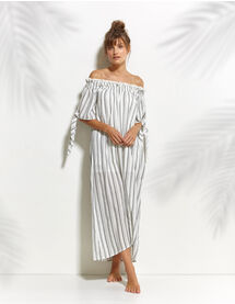 Lässiges Maxi-Kleid mit gesmokter Schulterpartie, kann off-shoulder getragen werden. Kurze Ärmel mit Bändern. Passt besonders gut zu zierlichen Sandalen.