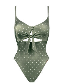 Badeanzug mit Soft Cups und längenverstellbaren, abnehmbaren Trägern. Knöpfe, Cut-outs und Schleife am Dekolleté. Dezentes, goldfarbenes Logo am Beinausschnitt.
