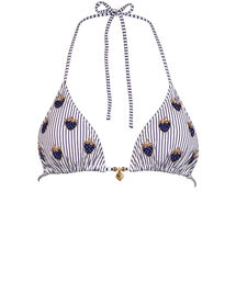 Bikini-Top in Triangel-Form. Soft Cups, Spaghetti-Träger im Nacken und Rücken zu binden. Zarte, goldene Erdbeere am Dekolleté.