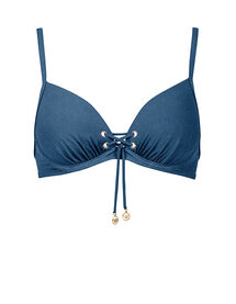 Bügel-Bikini-Top mit integrierten Soft Cups und verstellbaren, abnehmbaren Trägern, die im Nacken gebunden werden können. Schnürung mit goldenen W-Anhänger am Dekolleté. Ein Clipverschluss im Rücken bietet auch größeren Cups Halt.