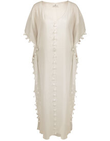 Langer Kaftan in Canvas-Weiß mit kleinem V-Ausschnitt und Miniquasten auf der Vorderseite und am Saum