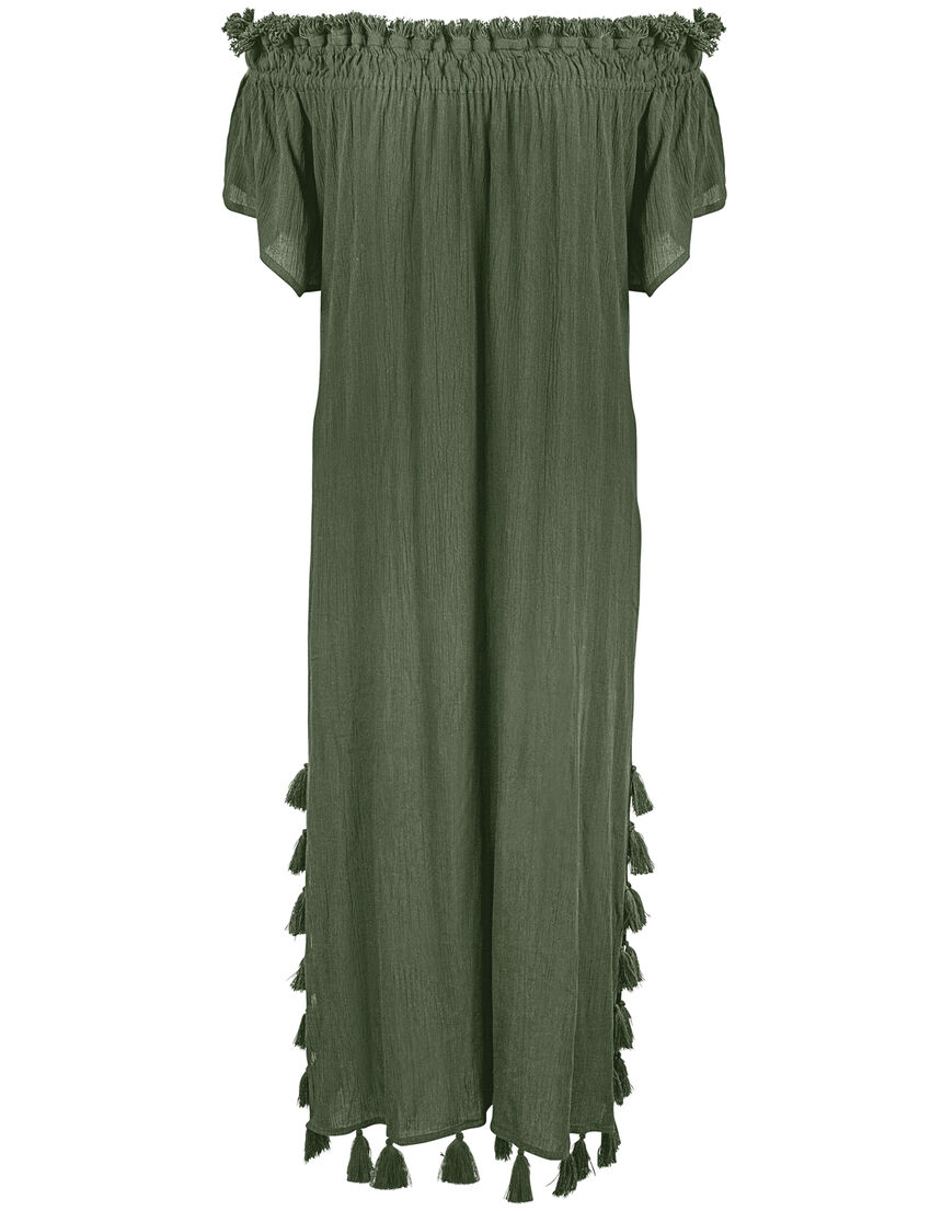 Casual maxi dress with a smocked shoulder section, can be worn off-shoulder. Short sleeve length and tassels along the hemline. Goes particularly well with delicate thong sandals.