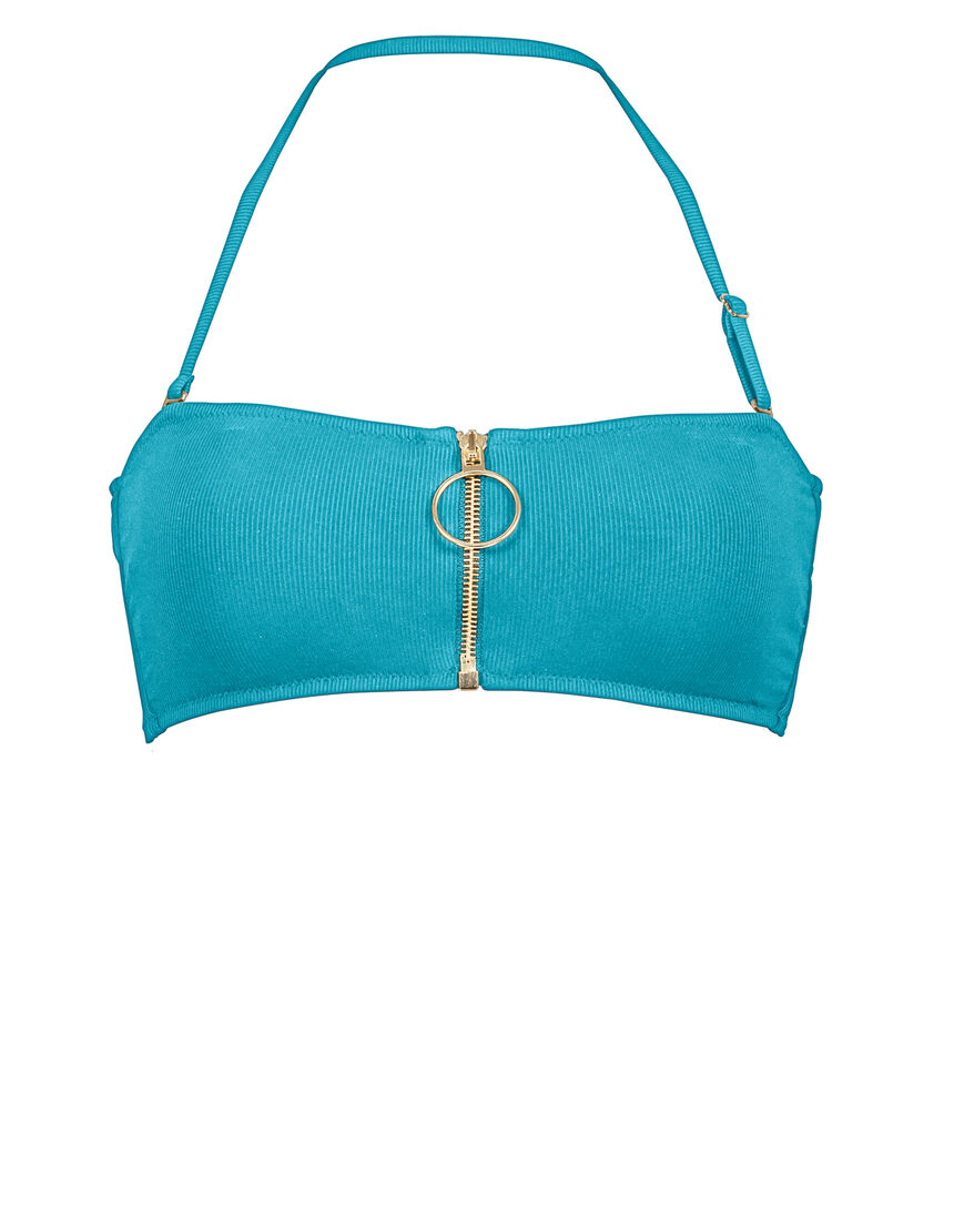 Strapless bandeau bikini top with soft cups. Gold-coloured zip at the front, clip fastener at the back.